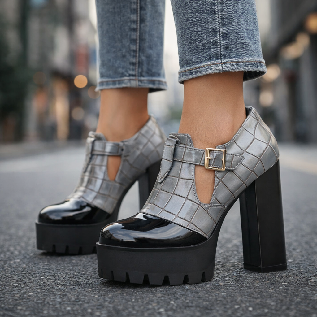 Designed with a structured upper and a solid platform base, these heels deliver confident lift with steady footing. The cutout strap layout adds definition through the midfoot, making them an easy anchor for both daytime looks and evening wear.