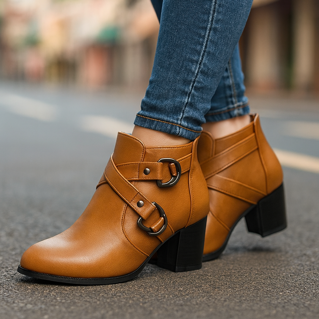 Built with a cushioned orthopedic insole and a shock-absorbing sole, these booties provide steady support with a grounded block heel for everyday wear. The double-buckle wrap detail adds structure and edge, making them a versatile match for denim, tailored pants, and seasonal layers.