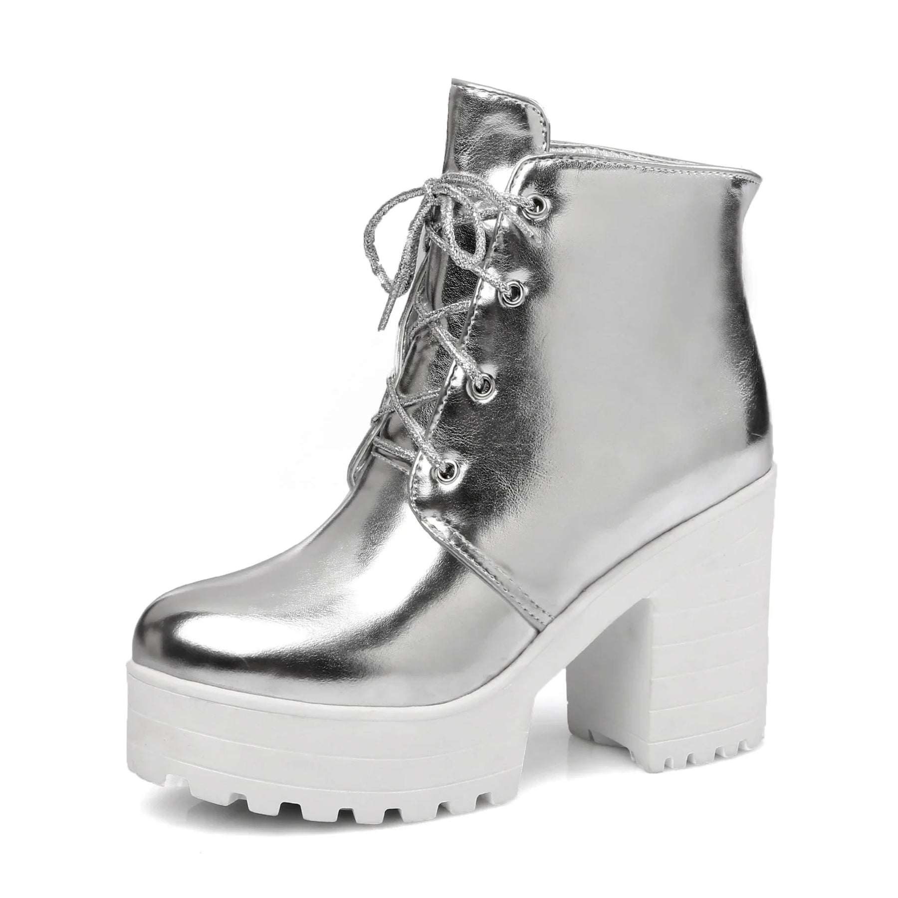 Constructed with a cushioned orthopedic insole and a stabilizing block platform, this pair delivers confident lift with controlled comfort. The metallic finish and lace-up front create a bold visual edge, while the structured base supports steady movement from street wear to night plans.